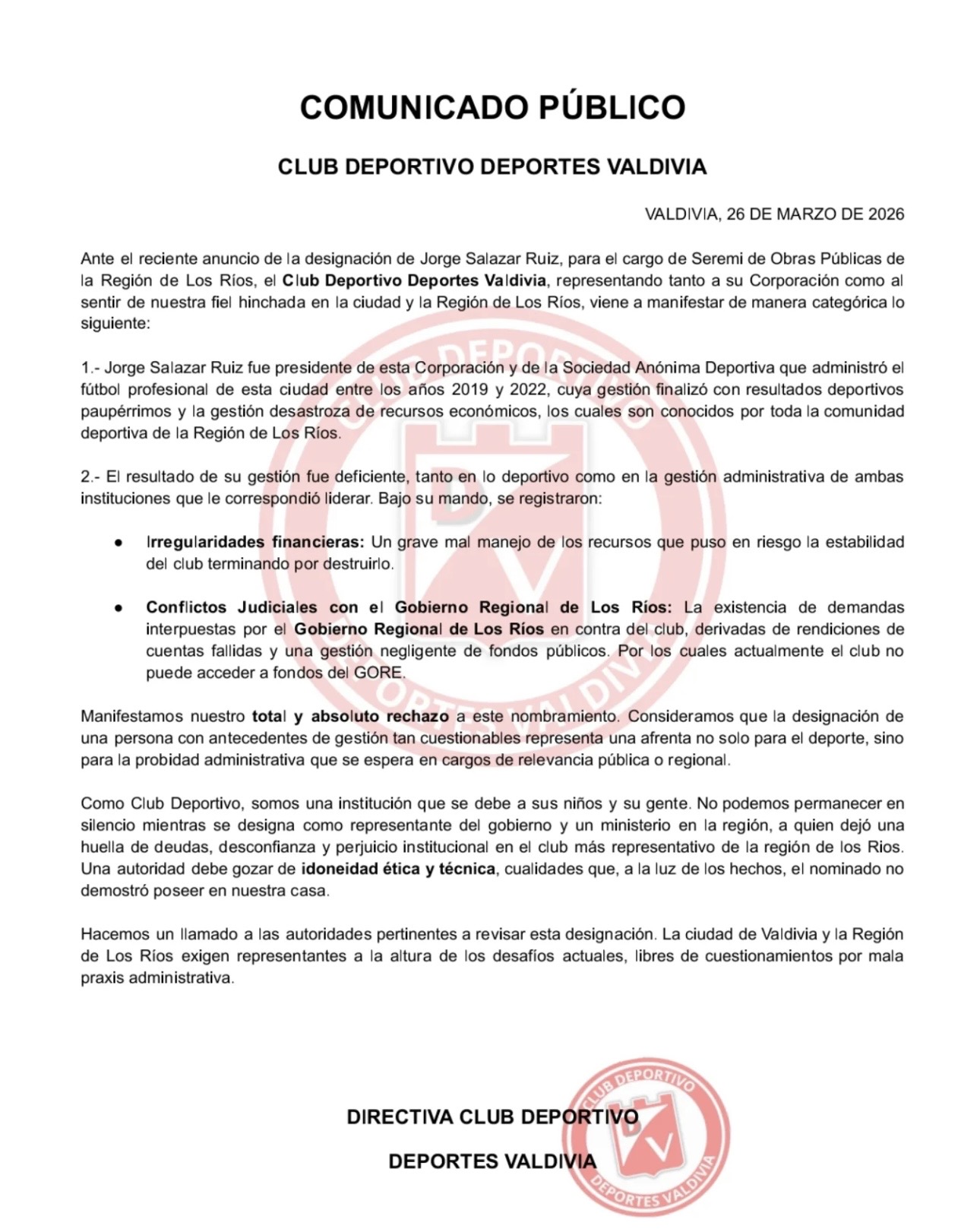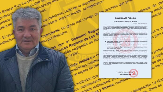 Mediante un comunicado público fechado en Valdivia el 26 de marzo de 2026, el Club Deportivo Deportes Valdivia manifestó su rechazo categórico a la designación de Jorge Salazar Ruiz como seremi de Obras Públicas en la Región de Los Ríos, aludiendo a su anterior gestión como presidente de la corporación y de la sociedad anónima deportiva del club.