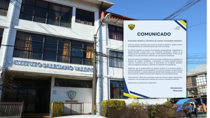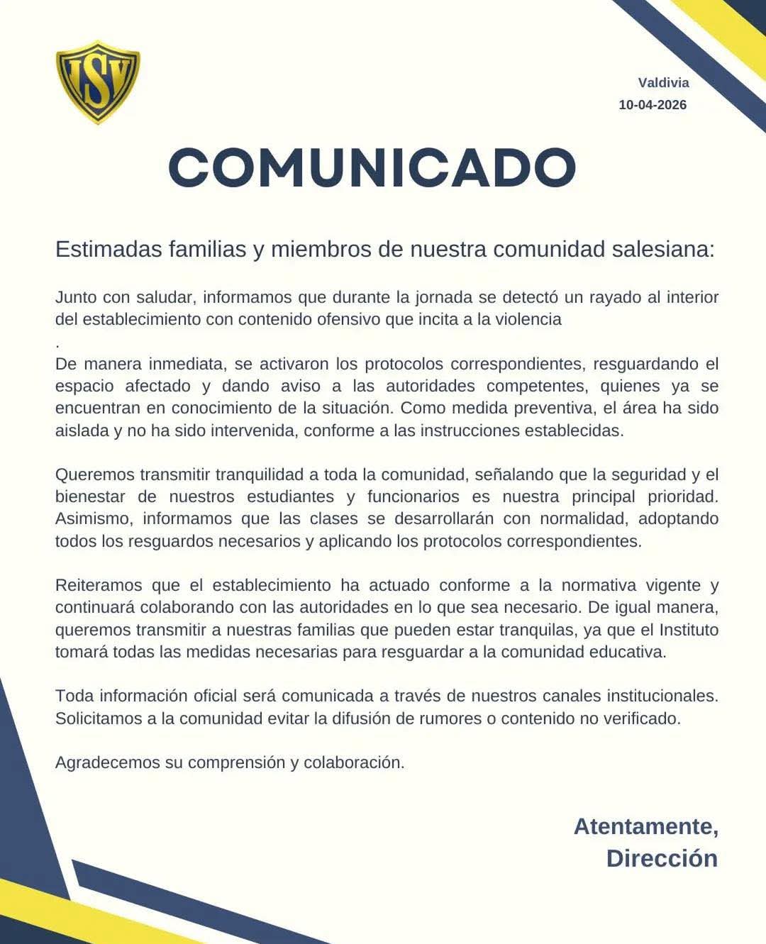 A través de un comunicado oficial emitido este viernes 10 de abril en Valdivia, la Dirección de un establecimiento salesiano informó la detección de un rayado con contenido ofensivo al interior del recinto, el cual “incita a la violencia”, lo que motivó la activación inmediata de los protocolos de seguridad.