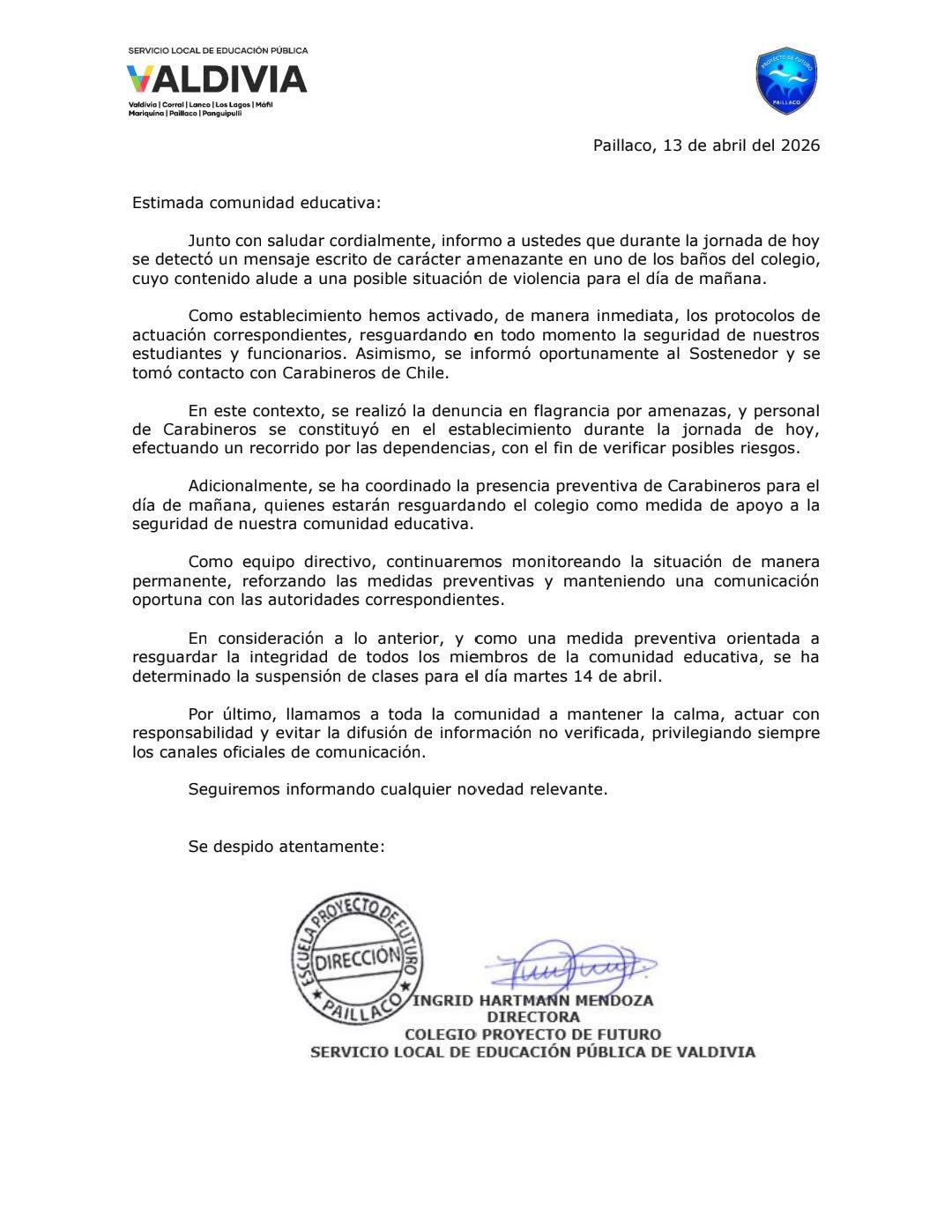 A través de un comunicado oficial, el Colegio Proyecto de Futuro de Paillaco, dependiente del Servicio Local de Educación Pública de Valdivia, informó la detección de un mensaje con contenido amenazante al interior de uno de los baños del establecimiento, situación que encendió las alertas durante la jornada de este lunes.