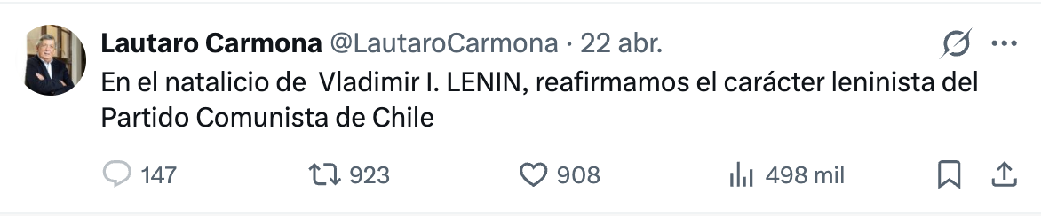 A través de su cuenta en la red social X, el dirigente sostuvo que “en el natalicio de Vladimir Lenin, reafirmamos el carácter leninista del Partido Comunista de Chile”, lo que rápidamente generó reacciones en distintos sectores políticos.