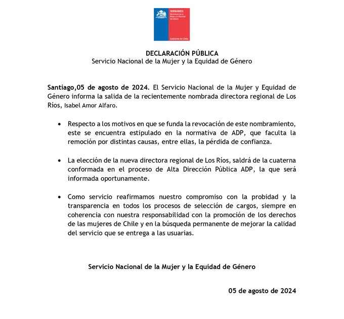 Servicio Nacional de la Mujer y la Equidad de Género Los Ríos entrega declaración pública sobre la situación de la directora regional